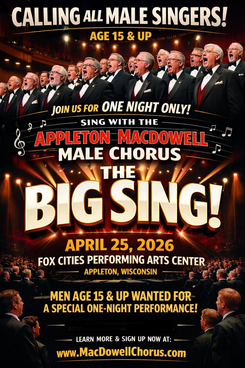 Tickets for Appleton MacDowell Male Chorus events held in the Fox Cities, when offered, are always available from all MacDowell Chorus members, and online via our ticket partner CUR8. The link to online sales is on this website in the “Performances and Tickets” page. An exception to this norm is required when we perform at the Fox Cities Performing Arts Center (FCPAC). Tickets for those performances are best bought in person at the FCPAC Ticket windows in their main lobby on the corner of College Avenue and Division Street. Otherwise, you can call them at (920) 730-3760. Appleton MacDowell Male Chorus is proud to partner with the Fox Cities Performing Arts Center to provide quality entertainment to our community!